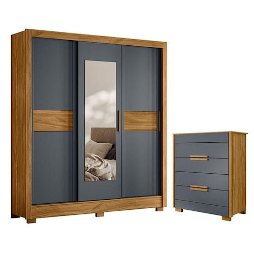 Organize seu quarto com elegância e o melhor custo benefício do mercado. Apresentamos o Guarda Roupa Casal Bahamas e Cômoda Dhara fabricados pela Moval. Guarda Roupa com 03 portas deslizantes e 02 gavetas com corrediças metálicas, portas laterais com moldura de 25mm, espelhos inclusos, puxadores em MDF, cabideiros em alumínio para melhor organização interna, sistema anti-empeno metálico, espaço ideal para roupas longas e pés em PVC. A cômoda possui 04 gavetas com corrediças telescópicas, moldura lateral de 25mm e tampo de 15mm, puxadores em MDF e pés em PVC. Fabricado com materiais de alta qualidade que garante resistência e durabilidade ao produto. Confira mais detalhes e aproveite!