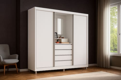 Desenvolvido em MDP de qualidade, possui duas portas, conjunto de rodízios reguláveis que deslizam sobre resistentes trilhos em alumínio, espaço interno amplo, prateleiras e cabideiros metálicos, gavetas externas, um maravilhoso espelho, porta jóias e maior durabilidade para que você aproveite ainda mais o produto.