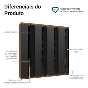 Possui uma pintura de alta resistência, que garante durabilidade e um acabamento impecável por muito mais tempo. A estrutura é na cor preta e as portas e puxadores em Preto, criando um visual sofisticado que se adapta a qualquer estilo de decoração. Os puxadores de 80 cm, fabricados em MDF, são um dos grandes diferenciais, trazendo um design alongado e moderno.