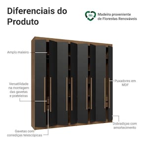 Possui uma pintura de alta resistência, que garante durabilidade e um acabamento impecável por muito mais tempo. A estrutura e os puxadores é em tom amadeirado Rustic e das portas em Preto, criando um visual sofisticado que se adapta a qualquer estilo de decoração. Os puxadores de 80 cm, fabricados em MDF, são um dos grandes diferenciais, trazendo um design alongado e moderno.