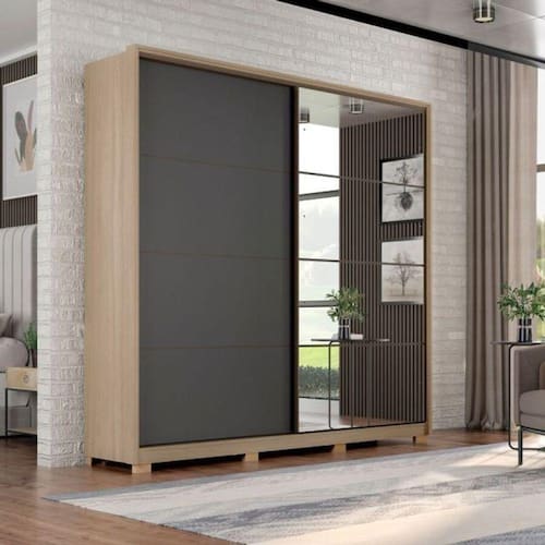 Guarda Roupa Casal Belga 2 Portas C/ 1 Porta Em Espelho C/ Pés Avena/grafito - Demartez Guarda-Roupa Casal 2 Portas De Correr Demartez C/ Espelho BelgaModelo imponente que embeleza o ambiente e que traz grande capacidade de acomodação e organização para roupas e pertences. Várias prateleiras e maleiro espaçosos proporcionam uma interna completa aliada as gavetas com corrediças telescópicas. Puxadores com acabamento bronze e as diversas configurações de espelhos garantem a sofisticação do móvel.Recomendações de limpeza: Para limpeza de seu móvel, use uma flanela seca ou umedecida. Não utilize produtos químicos que possam danificar o produto.Informações importantes:- A compra do produto não acompanha montagem/desmontagem.- Os objetos que ambientam as imagens, não acompanham o produto.- Fique atento: As cores das imagens podem sofrer alterações devido a luminosidade, configurações do monitor e até mesmo a percepção do usuário.Características do produto Modelo Belga Material MDP Peso suportado por gaveta 3 Kg Peso suportado por prateleira 5 Kg Pintura UV Dimensões do espelho 102,3 x 52 x 0,03 cm (A x L x C) Quantidade de cabideiros 2 Quantidade de espelhos 1 Quantidade de gavetas 3 Quantidade de portas 2 Quantidade de prateleiras 7 Tipo de corrediça Telescópica Tipo de portas De Correr Tipo de puxador Embutido Necessita montagem Sim Complexidade da montagem Alta Sistema de Montagem Parafuso e Girofix Quantidade de volumes 5 Marca Demartez Conteúdo da embalagem 1 Guarda Roupa Dimensões aproximadas do produto 230 X 217 X 55 cm (A x L x C) Dimensões aproximadas da embalagem 42 x 263 x 236 cm (A x L x C) Peso aproximado do produto 171,9 Kg Peso aproximado da embalagem 176,5 Kg Garantia do fornecedor 3 Meses Informações Adicionais Design moderno e ótima divisão interna Marca: DEMARTÊZ MOBÍLIA