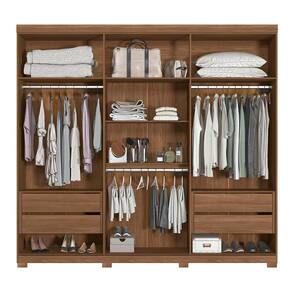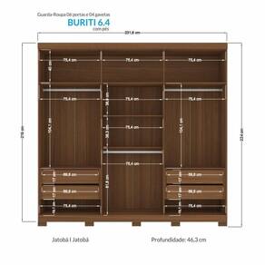 O Guarda-Roupa Buriti possui um design diferenciado e atemporal. São 6 portas, sendo 2 delas em MDF e com detalhe usinado ripado e puxadores pontuais em ABS para abertura. As demais portas em MDP seguem com puxadores em MDF revestido em formato grande. Internamente, possui 7 amplas prateleiras com muito espaço para guardar os pertences, 3 cabideiros em alumínio de excelente qualidade para pendurar as roupas, 4 gavetas com corrediças telescópicas que suportam muito mais peso, compartimento para guardar pertences de valor. Externamente, o acabamento é em textura Reverse semi fosco, suave ao toque, e que facilita a limpeza.