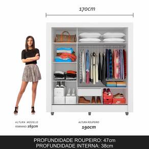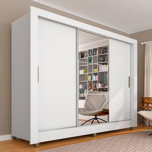 O Guarda Roupa Com Espelho 3 Portas 1 Gaveta Alice, é um roupeiro moderno com gaveta, além do ótimo espaço interno, ele tem um bonito acabamento e muito resistentes que dão maior destaque à cor.Detalhes Técnicos:Medidas do Guarda-roupa Montado: A:190cm | L:170cm | P:47cmMedidas do Espelho: 0508X0552X0003MMMateriais de Fabricação:- Material MDP 12 e 15mm- Revestimento: FF Fosco (Finish Foil)- Corrediça Metálica- Material dos pés: PVC- Material Cabideiro: Bastão Madeira-Tonalidade: Branco- Pintura semibrilho- Puxador : PolietilenoConteúdo da Embalagem:- 01 Guarda-roupa com Espelho- Acessório para MontagemObservações Importantes:- As imagens ambientadas são meramente ilustrativas e podem apresentar itens que não incorporam o produto;- Todos os nossos produtos são novos, acompanham documento fiscal e possuem garantia de 3 meses, essa garantia cobre somente defeitos de fabricação;- A entrega só será efetuada no endereço do CEP, caso o endereço seja diferente do CEP informado no pedido, a entrega terá cobrança adicional e o comprador arcará com as despesas;- Não realizamos entregas para zonas rurais, via caminhos fluviais e distritos, por isso não aceitamos CEP GERAL da região;- Não é possível realizar o agendamento de entrega do produto, é necessário que acompanhe o rastreio de seu pedido para saber a previsão de entrega;- As entregas somente serão realizadas para um responsável maior de idade (+18);- Enviamos para diversos estados, sendo assim nossas entregas são realizadas por transportadoras parceiras de nossa empresa. Confira as dimensões antes da compra e certifique-se de que o produto passará por elevadores, portas e corredores já que nossa entrega não inclui a subida de lances de escada, transporte por elevador e o lançamento de produtos, em caso de condomínios residenciais a entrega é feita somente até a portaria. Todas as entregas são realizadas em dias e horários comerciais;- Ao receber os seus produtos observe se a embalagem se encontra em perfeitas condições. Se você adquiriu algum móvel, confira atentamente a quantidade de volumes e o aspecto físico das embalagens. Confira também se a cor do móvel está de acordo com o seu pedido;- O prazo de cancelamento por arrependimento é de até 7 dias corridos a contar da data de recebimento;- Os produtos e assistências são enviados DESMONTADOS, MONTAGENS E DESMONTAGENS recomendamos sempre a contratação de um montador profissional e é válido lembrar que o custo desses serviços é por conta do comprador;- Objetos decorativos que aparecem na foto não acompanham o produto;- Evitar a exposição direta à luz solar e à umidade;- Para limpeza, limpar com pano macio e seco, não utilizar qualquer outro tipo de produtos químicos;- As cores do produto podem variar de acordo com o monitor, a iluminação do ambiente ou sua percepção visual;