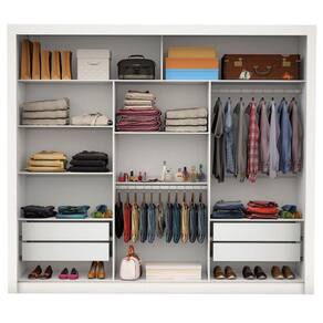 Guarda-Roupa Califórnia com 3 portas de correr, com espelho médio nas 3 portas, combinado com 4 gavetas, 6 prateleiras e 2 cabideiros. As roldanas em aço e o trilho de alumínio têm a função de potencializar o deslizar das portas. As seis prateleiras são ideais para colocar roupas de cama e de banho, perfumes, kits de maquiagem, caixinhas com acessórios e bolsas menores.