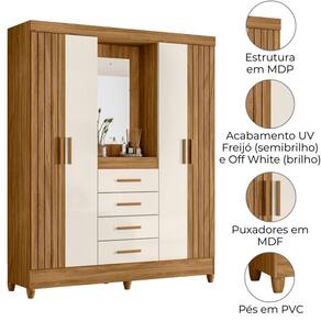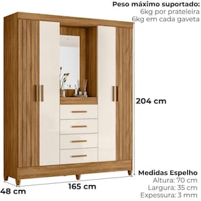 Moderno e versátil, o Guarda Roupa Casal Atenas foi desenvolvido para otimizar espaços com eficiência. Estrutura em MDP (15/ 12 mm) e acabamento em pintura UV. Possui capela central com espelho e prateleira, portas com dobradiças metálicas(sendo duas com detalhe frisado), cabideiro internob e gavetas com corrediças metálicas. Produto com dupla opção de montagem: pés em PVC ou sapatas plásticas (2 mm) conforme preferência do cliente. Este produto será entregue em 03 volumes.
