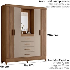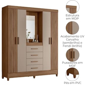 Moderno e versátil, o Guarda Roupa Casal Atenas foi desenvolvido para otimizar espaços com eficiência. Estrutura em MDP (15/ 12 mm) e acabamento em pintura UV. Possui capela central com espelho e prateleira, portas com dobradiças metálicas(sendo duas com detalhe frisado), cabideiro internob e gavetas com corrediças metálicas. Produto com dupla opção de montagem: pés em PVC ou sapatas plásticas (2 mm) conforme preferência do cliente. Este produto será entregue em 03 volumes.