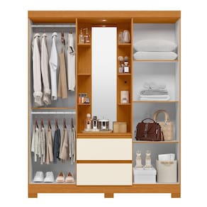 ESPECIFICAÇÕES: Estrutura em MDP Pintura UV 4 Portas Dobradiças metálicas Puxadores em MDF revestido nas portas 2 Gavetas Corrediças telescópicas Cabideiros em alumínio Camarim central com 1 luminária de LED Espelho incluso Pés em ABS Amplo espaço interno
