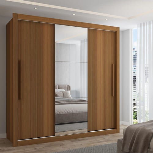 O(a) Guarda-Roupa Casal Cardiff 3 Portas 4 Gavetas com Espelho Cinamomo - Loja é produzido em MDP na escala de brilho Brilho, e possui um grau de dificuldade de montagem: Médio.