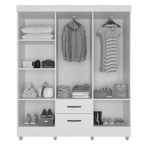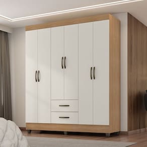 Feito em MDP. Contém 6 portas, 2 cabideiros em alumínio e 2 gavetas com corrediças metálicas, facilitando a abertura e deslizamento.