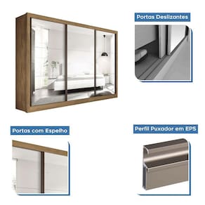 Guarda Roupa Casal Com 9 Espelhos 3 Portas Ravena Minastex Freijó Nao aguenta mais a bagunca no seu dormitorio? Com o Guarda-Roupa Ravena seu quarto ficara muito mais organizado e atraente. Ele e confeccionado com materiais de resistencia e qualidade, alem de possuir o espaco interno necessario para que nenhuma peca de roupa fique fora do lugar. Aproveite! Caracteristicas: Estilo: Moderno Acabamento: Pintura Origem do Produto: Nacional Ambiente Principal: Quarto Tipo de Guarda-roupa: Casal Escala de Brilho: Brilhante Material Principal: MDP Possui Cabideiros: 03 Guarda-Roupa Suporta Ate: 90 kg Possui Pes: Nao Possui Calceiros: Sim Possui Espaco para Vestidos Longos: Sim Possui Sapateira: Nao Necessita Montagem: Sim Complexidade da Montagem: Alta, deve ser montado por um montador especializado Sistema de Montagem: Parafusos e Minifix