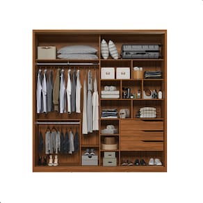 Várias prateleiras e maleiro espaçosos proporcionam uma interna completa aliada as gavetas com corrediças telescópicas, puxadores com acabamentobronze.