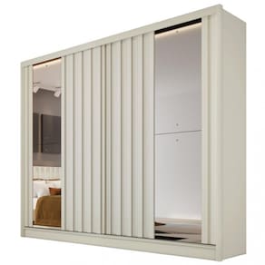 Características: Estrutura em MDF Acabamento em Pintura UV 2 Portas de correr 4 Gavetas Corrediças telescópicas Ripado Espelho Puxador embutido