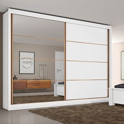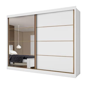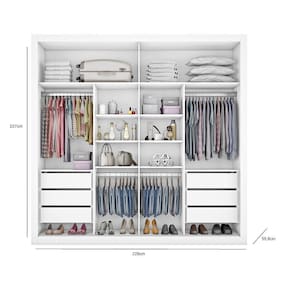 Características Material 100 MDF 2 Portas de correr Espelho 6 Gavetas 8 Prateleiras Corrediças telescópicas 2 Cabideiros em Alumínio 2 Calceiro em Alumínio