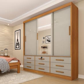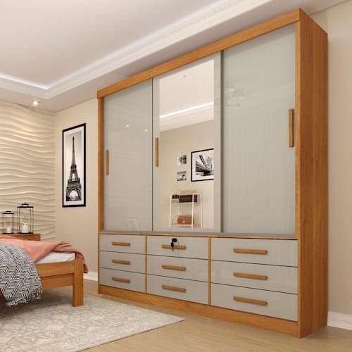 O Guarda Roupa Chicago possui um design inovador, com material de alta qualidade com cores incríveis. Guarda roupa em MDP, com corrediças telescópicas, 9 gavetas externas, trilho inferior em alumínio, cabideiros em alumínio, puxadores em PVC. Deixando o ambiente mais harmonioso e lindo. Acabamento da Prateleira: Pintura Escala de Brilho da Prateleira: Semi-Brilho Possui Cabideiros: 02 Acabamento da Gaveta: Pintura Escala de Brilho da Gaveta: Semi-Brilho Material do Puxador da Gaveta: PVC Possui Organizador de Gaveta: Não Acabamento da Porta: Pintura Escala de Brilho da Porta: Brilhante Material do Puxador da Porta: PVC Altura do Espelho: 135 cm Ambiente Principal: Quarto Complexidade da Montagem: Média: pode ser montado por mais de uma pessoa e/ou necessite de maior conhecimento para montagem Cor: Cinamomo/Off White Cor do Produto: Cinamomo/Off White Escala de Brilho: Semi-Brilho Espessura do Espelho: 3 mm Fita Integrada: Sim Formato do Espelho: Retangular Gaveta com Chave: Sim Itens Inclusos: 1 Guarda Roupa, Kit Ferragens e Manual de Montagem. Largura do Espelho: 50 cm Linha ou Coleção: Chicago Manual de Montagem e Instalação: https://cdn2.madeiramadeira.com.br/atributo/tcil-moveis/508632-438812.pdf Material da Gaveta: MDP Material da Porta: MDP Material da Prateleira: MDP Material Principal: MDP Necessita Montagem: Sim Origem do Produto: Nacional Peso: 159,3 kg Peso Máximo por Gaveta: 10 kg Peso Máximo por Prateleira: 10 kg Possui Calceiros: 01 Possui Espelho: Sim Possui Pés: Não Possui Portas: 03 Possui Prateleiras: 04 Quantidade de Espelho: 01 Recomendações de Uso, Manutenção e Limpeza: Não colocar o produto em lugar úmido, não arrastar, limpar somente com pano macio e seco, não expor o produto a incidência de luz solar, não colocar peso superior ao indicado. Sistema de Montagem: Parafusos e Cavilhas. Tipo de Corrediça da Gaveta: Metálica Simples Tipo de Dobradiça/Corrediça da Porta: Metálica Tipo de Fixação do Espelho: Fita Dupla Face Tipo de Gaveta: Externa Tipo de Guarda-Roupa: Casal Tipo de Puxador da Gaveta: Externo Tipo de Puxador da Porta: Externo