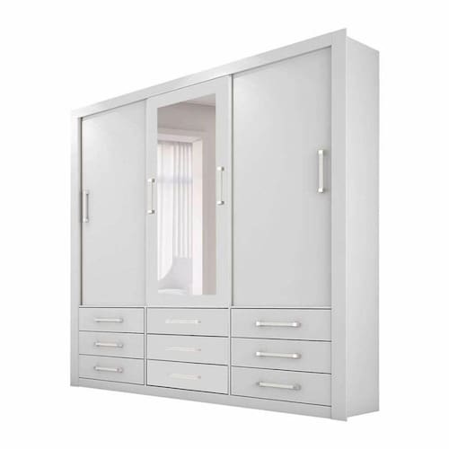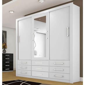 Guarda Roupa com maior resistência, durabilidade e acabamento, revestimento interno e externo: Pintura em estufas modernas com UV (ultra violeta), são túneis que secam os produtos através de lâmpadas especiais que reproduzem artificialmente os raios ultravioletas do sol. Modelo com corrediça metálica em aço, 9 gavetas espaçosas, perfil em alumínio, roldanas de aço carbono com rolamento, divisão ele/ela. Espelho fixado com dupla face e parafuso para maior segurança.