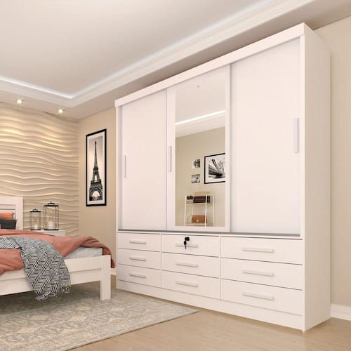 O Guarda Roupa Chicago possui um design inovador, com material de alta qualidade com cores incríveis. Guarda roupa em MDP, com corrediças telescópicas, 9 gavetas externas, trilho inferior em alumínio, cabideiros em alumínio, puxadores em PVC. Deixando o ambiente mais harmonioso e lindo. Escala de Brilho da Prateleira: Semi-Brilho Possui Cabideiros: Sim Acabamento da Gaveta: Pintura Escala de Brilho da Gaveta: Semi-Brilho Possui Organizador de Gaveta: Não Acabamento da Porta: Pintura Escala de Brilho da Porta: Semi-Brilho Material do Puxador da Porta: PVC Acabamento dos Pés: Pintura Ambiente Principal: Quarto codigo_ean: 7909903237779 Complexidade da Montagem: Alta: deve ser montado por um montador especializado Cor: Neve Cor do Produto: Neve Escala de Brilho: Fosco Espessura do Espelho: 3 mm Formato do Espelho: Retangular Linha ou Coleção: Chicago Manual de Montagem e Instalação: https://cdn2.madeiramadeira.com.br/atributo/tcil-moveis/508632-438812.pdf Material da Gaveta: MDP Material da Porta: MDP Material da Prateleira: MDP Material Principal: MDP Necessita Montagem: Sim Origem do Produto: Nacional Peso: 159,3 kg Peso Máximo por Gaveta: 10 kg Peso Máximo por Prateleira: 10 kg Possui Calceiros: 01 Possui Espelho: Sim Possui Pés: Não Possui Portas: Sim Produto Montado: Sim Quantidade de Espelho: 01 Recomendações de Uso, Manutenção e Limpeza: Não colocar o produto em lugar úmido, não arrastar, limpar somente com pano macio e seco, não expor o produto a incidência de luz solar, não colocar peso superior ao indicado. Sistema de Montagem: Parafusos, Cavilhas e Pregos Tipo de Corrediça da Gaveta: Metálica Telescópica Tipo de Dobradiça/Corrediça da Porta: Metálica Tipo de Fixação do Espelho: Silicone Tipo de Gaveta: Externa Tipo de Guarda-Roupa: Casal Tipo de Puxador da Gaveta: Externo Tipo de Puxador da Porta: Externo Ean: 7909903237779