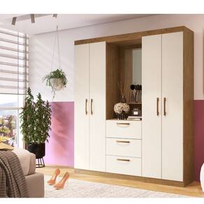 "Guarda-Roupa Panamá, famoso Capelinha, 4 portas 3 gavetas, incluindo espelho para organizar melhor seu quarto. Deixe seu quarto mais organizado e bonito com o Guarda-Roupa Panamá da Megasul. Com um design inovador, vai agregar charme ao quarto e também facilitar a arrumação de roupas e objetos graças ao amplo e bem estruturado espaço interior. E isso não é tudo. É muito durável, feito de materiais de qualidade. A estrutura é em MDP e o tratamento superficial é em verniz UV para maior durabilidade. A porta abre, além de possuir 3 gavetas, 2 cabides e uma charmosa penteadeira para melhor organização.