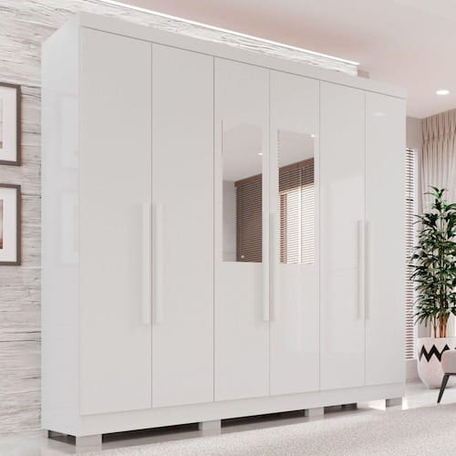 Este lindo Guarda Roupa com Espelho 6 Portas 2 Gavetas França é um produto de excelente qualidade, diferenciado pela sua resistência, durabilidade, funcionalidade e beleza, ele é a melhor opção para deixar seu dormitório muito mais arrumado e convidativo. Com corrediças telescópicas que permitem uma abertura total das gavetas, parte interna espaçosa, divisões internas que oferecem praticidade e organização, puxadores de madeira que garante maior durabilidade, suporte embaixo das gavetas para dar uma sustentação reforçada e cabideiro em alumínio. Se encaixa facilmente em vários estilos de decoração com cores modernas. Aproveite, você merece! Acabamento da Prateleira: Pintura UV Escala de Brilho da Prateleira: Brilhante Possui Cabideiros: 02 Acabamento da Gaveta: Pintura UV Material do Puxador da Gaveta: MDF Possui Organizador de Gaveta: Não Acabamento da Porta: Pintura UV Escala de Brilho da Porta: Brilhante Material do Puxador da Porta: MDF Altura do Espelho: 70 Altura dos Pés: 4 Ambiente Principal: Quarto Complexidade da Montagem: Alta: deve ser montado por um montador especializado Cor: Branco Cor do Produto: Branco Escala de Brilho: Brilhante Espessura do Espelho: 3 Formato do Espelho: Retangular Gaveta com Chave: Não Itens Inclusos: 1 Guarda Roupa, kit ferragens e manual de montagem Largura do Espelho: 20 Linha ou Coleção: FRANÇA Manual de Montagem e Instalação: https://cdn2.madeiramadeira.com.br/atributo/salleto/1716385-roupeiro-recife-6-portas.pdf Material da Gaveta: MDP Material da Porta: MDP Material da Prateleira: MDP Material dos Pés: Polipropileno Material Principal: MDP modular: Não Necessita Montagem: Sim Origem do Produto: Nacional Peso: 95.90000000000001 Peso Máximo por Gaveta: 5 Peso Máximo por Prateleira: 3 Possui Calceiros: Não Possui Espelho: Sim Possui Pés: 08 Possui Portas: Sim Possui Prateleiras: Sim Quantidade de Espelho: 02 Espelhos com Tamanhos Iguais Quantidade de Gavetas: 02 Gavetas Quantidade de Prateleiras: 06 Prateleiras Recomendações de Uso, Manutenção e Limpeza: Limpar com flanela ou pano Pano levemente umedecido e pano seco. Não utilizar produtos de limpeza. Não utilizar produtos abrasivos. Não expor o produto diretamente à luz solar e à umidade. Sistema de Montagem: Parafusos, Cavilhas, Dobradiças e Puxadores. Tipo de Corrediça da Gaveta: Metálica Telescópica Tipo de Dobradiça/Corrediça da Porta: Metálica Tipo de Fixação do Espelho: Parafusos Tipo de Gaveta: Interna Tipo de Guarda-Roupa: Casal Tipo de Puxador da Gaveta: Externo Tipo de Puxador da Porta: Externo