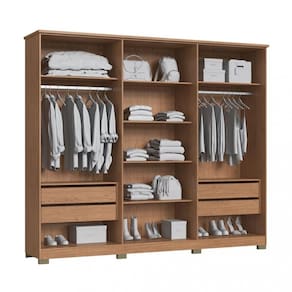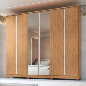 Características: Estrutura 100 em MDF 4 Gavetas Corrediças telescópicas de extração total Cabideiros de alumínio 6 Portas com acabamento em ângulo de 45º Portas com dobradiças de amortecedor Interno ele e ela Prateleiras Contém espelho Contém pés Produto flex com duas opções de tonalidade no espaçador da porta