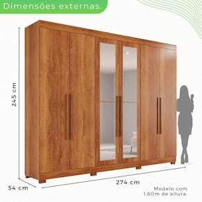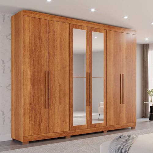 Organize e encontre com mais facilidade suas roupas preferidas, este atraente guarda-roupa Órion Premium com Espelho é confeccionado com materiais de qualidade e resistência, 100% MDF, diferenciado pela sua funcionalidade e beleza, ele é a melhor opção para deixar seu dormitório mais arrumado e convidativo, além de deixar organizado do seu jeito. Com corrediças telescópicas que permitem uma abertura total das gavetas, cores modernas, parte interna espaçosa, divisão ele e ela com prateleiras internas amplas quem oferecem praticidade e organização, contando também com sapateira embutida. Aproveite!! Acabamento da Prateleira: Pintura UV Escala de Brilho da Prateleira: Fosco Possui Cabideiros: 02 Acabamento da Gaveta: Pintura UV Possui Organizador de Gaveta: Não Acabamento da Porta: Pintura UV Escala de Brilho da Porta: Fosco Material do Puxador da Porta: MDF Altura do Espelho: 100 Altura dos Pés: 5 Ambiente Principal: Quarto Complexidade da Montagem: Alta: deve ser montado por um montador especializado Cor: Cinamomo Cor do Produto: Cinamomo Escala de Brilho: Fosco Espessura do Espelho: 3 Formato do Espelho: Retangular Gaveta com Chave: Não Itens Inclusos: 1 Guarda Roupa, kit ferragens e manual de montagem Largura do Espelho: 30 Linha ou Coleção: Órion Premium Manual de Montagem e Instalação: https://cdn2.madeiramadeira.com.br/atributo/salleto/1719501-roupeiro-orion-6-portas.pdf Material da Gaveta: MDF Material da Porta: MDF Material da Prateleira: MDF Material dos Pés: Polipropileno Material Principal: MDF modular: Não Necessita Montagem: Sim Origem do Produto: Nacional Peso: 228.4 Peso Máximo por Gaveta: 5 Peso Máximo por Prateleira: 3 Possui Calceiros: 01 Possui Espelho: Sim Possui Pés: 08 Possui Portas: Sim Possui Prateleiras: Sim Quantidade de Espelho: 04 Espelhos com Tamanhos Iguais Quantidade de Gavetas: 06 Gavetas Quantidade de Prateleiras: 08 Prateleiras Recomendações de Uso, Manutenção e Limpeza: Pano levemente umedecido e pano seco. Não utilizar produtos de limpeza abrasivos. Sistema de Montagem: Parafusos, Cavilhas, Dobradiças e Puxadores. Tipo de Corrediça da Gaveta: Metálica Telescópica Tipo de Dobradiça/Corrediça da Porta: Metálica Tipo de Fixação do Espelho: Parafusos Tipo de Gaveta: Interna Tipo de Guarda-Roupa: Casal Tipo de Puxador da Gaveta: Externo Tipo de Puxador da Porta: Externo