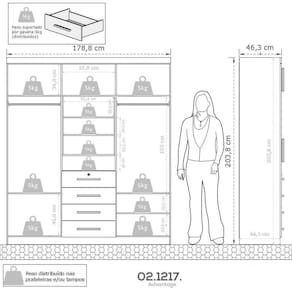 Com excelente acabamento, os guarda-roupas da Batrol Móveis possuem materiais que permitem que as peças tenham encaixes mais suaves, o que resulta em um design mais interessante e sofisticado. Fabricados em MDP, possuem chapas homogêneas, resistentes e fáceis de montar. Acabamento da Prateleira: Pintura UV Escala de Brilho da Prateleira: Fosco Possui Cabideiros: Sim Acabamento da Gaveta: Pintura UV Escala de Brilho da Gaveta: Semi-Brilho Material do Puxador da Gaveta: MDF Possui Organizador de Gaveta: Não Acabamento da Porta: Pintura UV Escala de Brilho da Porta: Fosco Material do Puxador da Porta: MDF Altura do Espelho: 63 cm Ambiente Principal: Quarto codigo_ean: 7900288025326 Complexidade da Montagem: Média: pode ser montado por mais de uma pessoa e/ou necessite de maior conhecimento para montagem Cor: Freijó/ Off-White Cor do Produto: Freijó/ Off-White Cor Interna: Freijó Escala de Brilho: Semi-Brilho Espessura da Estrutura (mm): 15 mm Espessura das Portas (mm): 15 mm Espessura das Prateleiras (mm): 12 mm Espessura do Espelho: 3 mm Espessura do Fundo (mm): 3 mm Espessura do Fundo das Gavetas (mm): 3 mm Fita Integrada: Sim Formato do Espelho: Retangular Gaveta com Chave: Sim Itens Inclusos: 1 Guarda Roupa 7 Portas 4 Gavetas, 1 Kit Ferragens e 1 Manual de Montagem Largura do Espelho: 43,5 cm Linha ou Coleção: Advantage Manual de Montagem e Instalação: https://product-hub-prd.madeiramadeira.com.br/969756/documents/baf50766-1ee2-4ef8-8746-1d120e255e1647dbd264cd7da3611436501217.pdf Marca: Batrol Móveis Material da Gaveta: MDP Material da Porta: MDP Material da Prateleira: MDP Material Principal: MDP modular: Não Montagem Flex: Não Necessita Montagem: Sim Origem do Produto: Nacional Peso: 119,8 kg Peso Máximo por Gaveta: 5 kg Peso Máximo por Prateleira: 5 kg Possui Calceiros: Não Possui Capelinha: Sim Possui Espelho: Sim Possui Pés: Não Possui Portas: Sim Possui Prateleiras: Sim Produto Montado: Sim Quantidade de Cabideiros: 02 Cabideiros Quantidade de Espelho: 01 Quantidade de Gavetas: 04 Gavetas Quantidade de Prateleiras: 06 Prateleiras Recomendações de Uso, Manutenção e Limpeza: Pano úmido Sistema de Montagem: Parafusos e Cavilhas Tipo de Corrediça da Gaveta: Metálica Simples Tipo de Dobradiça/Corrediça da Porta: Aço Tipo de Fixação do Espelho: Fita Dupla Face Tipo de Gaveta: Externa Tipo de Guarda-Roupa: Casal Tipo de Puxador da Gaveta: Externo Tipo de Puxador da Porta: Externo