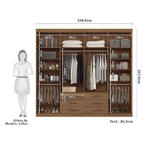 Características: Estrutura: MDP 12mm e 15mm Acabamento: Pintura e Verniz Quantidade de Portas: 8 de Abrir/Bater Tipo de Dobradiças: Metálicas Quantidade de Gavetas: 6 Tipo de Corrediças: Metálicas Telescópicas Quantidade e Tipo de Cabideiros: 4 em Alumínio Tipo de Puxador: Plástico ABS Tipo de Pés: Rodapé Sistema de Montagem: Cavilhas, Parafusos e Minifix Itens Inclusos: 1 Guarda Roupa, Kit Ferragens e Manual de Montagem Garantia: 3 meses