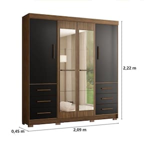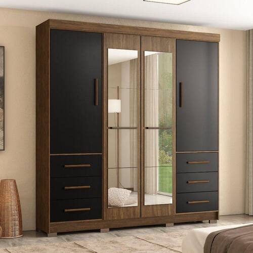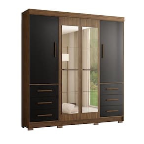 O Guarda Roupa 4 portas Estrela possui uma excelente divisão interna, com colméia central. Este "roupeirão" é robusto, produzido 100% em MDP, possui 6 gavetas com corrediças metálicas, puxadores em MDF, cabideiros em alumínio. Para completar, o Guarda Roupa Estrela conta com espelhos super úteis e que dão um toque ainda mais bonito ao móvel. Acabamento da Prateleira: Pintura Escala de Brilho da Prateleira: Fosco Possui Cabideiros: 02 Acabamento da Gaveta: Pintura Escala de Brilho da Gaveta: Fosco Material do Puxador da Gaveta: MDF Possui Organizador de Gaveta: Não Acabamento da Porta: Pintura Escala de Brilho da Porta: Fosco Material do Puxador da Porta: MDF Altura do Espelho: 39.5 Altura dos Pés: 5 Ambiente Principal: Quarto Complexidade da Montagem: Média: pode ser montado por mais de uma pessoa e/ou necessite de maior conhecimento para montagem Cor: Nogueira/Preto Cor do Produto: Nogueira/Preto Escala de Brilho: Fosco Espessura do Espelho: 3 Fita Integrada: Sim Formato do Espelho: Retangular Gaveta com Chave: Não Itens Inclusos: 1 Guarda-Roupa, Kit Ferragens e Manual de Montagem. Largura do Espelho: 32.8 Manual de Montagem e Instalação: https://cdn2.madeiramadeira.com.br/atributo/mapi-moveis/560028-manual-roupeiro-estrela-1166.pdf Material da Gaveta: MDP Material da Porta: MDP Material da Prateleira: MDP Material dos Pés: ABS Material Principal: MDP Necessita Montagem: Sim Origem do Produto: Nacional Peso: 146.2 Peso Máximo por Gaveta: 5 Peso Máximo por Prateleira: 5 Possui Calceiros: Não Possui Espelho: Sim Possui Pés: 08 Possui Portas: 04 Possui Prateleiras: 08 Quantidade de Espelho: 08 Espelhos com Tamanhos Iguais Recomendações de Uso, Manutenção e Limpeza: Limpar com flanela ou pano macio seco, não utilizar produtos abrasivos, desengordurantes, álcool ou qualquer outro produto químico. Não expor o produto diretamente à luz solar e à umidade. Sapatas Niveladoras: Não Sistema de Montagem: Parafusos, porca cilindricas, cavilhas e pregos Tipo de Corrediça da Gaveta: Metálica Simples Tipo de Dobradiça/Corrediça da Porta: Alumínio Tipo de Fixação do Espelho: Fita Dupla Face Tipo de Gaveta: Externa Tipo de Guarda-Roupa: Casal Tipo de Puxador da Gaveta: Externo Tipo de Puxador da Porta: Externo Marca: Marafon Móveis
