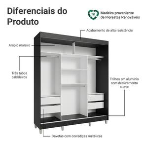 Possui quatro gavetas espaçosas, ideais para organização de roupas e acessórios, com corrediças metálicas para maior durabilidade. Conta também três cabideiros, garantindo que tudo tenha seu lugar. O acabamento de alta resistência é em preto, unindo elegância e resistência.