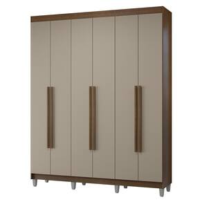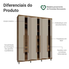 Com acabamento de alta resistência, garantindo durabilidade por muito mais tempo. A estrutura e os puxadores em tom amadeirado Rustic combinam com as portas no tom Crema, criando um visual elegante e moderno. Os puxadores de 80 cm, fabricados em MDF, são um diferencial que destaca o design alongado do móvel. Os pés elevam o guarda-roupa, agregando elegância e facilitando a limpeza do ambiente.