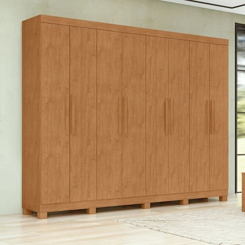 Características: 4 Gavetas 8 Portas 6 Prateleiras Cabideiros em PVC Corrediças telescópicas Costas inteiriças Espaço para sapatos e roupas longas Estrutura em MDP com chapas de 12 e 15mm Gavetas com distanciadores em MDF Maleiro individual Puxadores em MDF Pés Peso suportado por gaveta:4kg Peso suportado por prateleira:6kg
