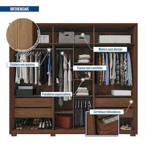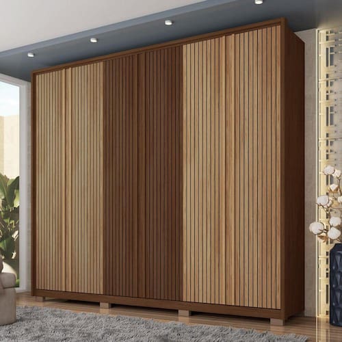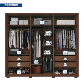 O Roupeiro Suburban da Espresso é um móvel de design moderno e funcional, ideal para quem busca por espaço e organização para suas roupas e pertences pessoais. Fabricado em MDP que garante toda resistência e durabilidade, suas dobradiças de 35 mm, cabideiro em alumínio, gavetas amplas com corrediças telescópicas e puxadores em alumínio permitirá o bom funcionamento para sua rotina. Os pés e sapatas são opcionais podendo escolher usar durante a montagem. O detalhe das portas com ripado dá um toque especial e moderno ao móvel e ao seu quarto. Acabamento da Prateleira: Pintura UV Escala de Brilho da Prateleira: Fosco Possui Cabideiros: Sim Acabamento da Gaveta: Pintura UV Escala de Brilho da Gaveta: Fosco Material do Puxador da Gaveta: MDF Possui Organizador de Gaveta: Não Acabamento da Porta: Pintura UV Escala de Brilho da Porta: Fosco Material do Puxador da Porta: MDF Acabamento dos Pés: Laca Altura dos Pés: 5 Altura Máxima dos Pés: 5.0000 Ambiente Principal: Quarto codigo_ean: 7909903477946 Complexidade da Montagem: Alta: deve ser montado por um montador especializado Cor: Havana/Buriti/Havana Cor do Produto: Havana/Buriti/Havana Cor Flex: Não Cor Interna: Havana Escala de Brilho: Fosco Gaveta com Chave: Não Guarda-Roupa Suporta Até (kg): 66 kg Itens Inclusos: 1 Guarda Roupa, Kit ferragens e Manual de Montagem Linha ou Coleção: Rooms Manual de Especificação Técnica: https://product-hub-prd.madeiramadeira.com.br/875108/documents/ab089176-6b10-493b-885b-0828e0bcd470939ftroupeirocoliseu274g6p.pdf Manual de Montagem e Instalação: https://product-hub-prd.madeiramadeira.com.br/875108/documents/232d9eff-2f7f-41c4-99a3-493af700567c0938eqroupeirocxcmdediCAod.pdf Material da Gaveta: MDP Material da Porta: MDF/MDP Material da Prateleira: MDP Material dos Pés: ABS Material Principal: MDP modular: Não Montagem Flex: Não Necessita Montagem: Sim Origem do Produto: Nacional Peso: 223,14 kg Peso Máximo por Gaveta: 4 kg Peso Máximo por Prateleira: 8 kg Possui Espaço para Vestidos Longos: Sim Possui Espelho: Não Possui Espelho Interno: Não Possui Ganchos: Não Possui iluminação: Não Possui Painel de TV: Não Possui Pés: 08 Possui Portas: Sim Possui Prateleiras: Sim Possui Sapateira: Não Produto Montado: Sim Quantidade de Gavetas: 04 Gavetas Quantidade de Prateleiras: 09 Prateleiras Recomendações de Uso, Manutenção e Limpeza: Limpar com pano macio levemente umedecido e em seguida pano macio seco. Não utilizar produtos abrasivos (lixas, esponjas) e/ou produtos a base de solventes (thinner, aguarrás). Sapatas Niveladoras: Sim Sistema de Montagem: Utiliza-se na montagem do produto sistema de fixação minifix, dobradiças, dispositivos angulares, cavilhas, parafusos, porcas cilindricas, entre outros; Suporta Até (kg): 66 kg Tipo de Corrediça da Gaveta: Metálica Telescópica Tipo de Dobradiça/Corrediça da Porta: Metálica Tipo de Gaveta: Interna Tipo de Guarda-Roupa: Casal Tipo de Puxador da Gaveta: Embutido Tipo de Puxador da Porta: Externo Ean: 7909903477946