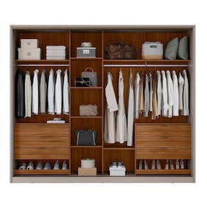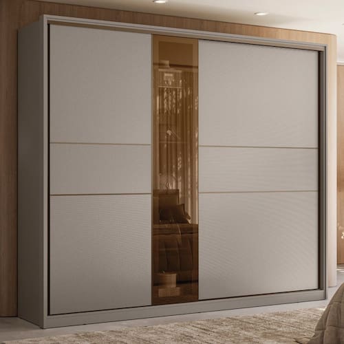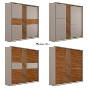 Caracteristicas: 6 Gavetas internas corredicas telescopicas 6 Nichos 2 Portas de correr com montagem flex, sendo uma com vidro reflecta 2 Prateleiras Acabamento Prime TX e Touch Cabideiros, puxadores e trilhos metalicos Estrutura 100 em MDF 12,15,17 e 20mm Possui mini sapatas Revestimento em pintura UV Sapateira interna
