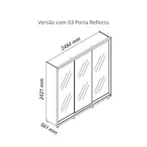 Caracteristicas: 4 Cabideiros em aluminio 6 Gavetas com corredicas telescopicas 3 Portas deslizantes em vidro reflecta 7 Prateleiras interna Acabamento com requadro em aluminio Espaco interno com divisoria para ela-ele Espaco para sapatos Estrutura 100 em MDF 12,15 e 20mm Iluminacao LED em tonalidade quente nas laterais e divisorias Pes em MDF Puxadores tipo perfil