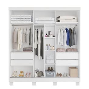 Características: - Estrutura 100% MDF: Alta resistência e durabilidade. - Divisão ELE e ELA: Amplo espaço interno para uma organização eficiente. - 6 portas com puxadores de madeira: Design sofisticado e natural. - 4 gavetas internas: Corrediças telescópicas para deslizamento suave. - Costas inteiras: Maior estabilidade e resistência. - Nicho organizador com 3 prateleiras centrais: Espaço para exibir suas peças favoritas. - Espaço para roupas longas e cabideiros de alumínio: Mantém tudo arrumado e acessível. Importante: