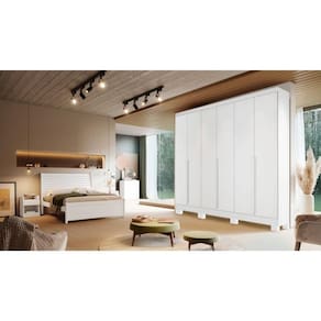 Guarda Roupa Casal Curitiba 100% Mdf 6 Portas De Bater Puxador Em Madeira Costa Inteiriça - Bianchi Branco Guarda Roupa Casal Curitiba 100% MDF 6 Portas De Bater Puxador em Madeira Costa Inteiriça - BianchiGuarda Roupa Casal Curitiba 100% MDF 6 Portas De Bater Puxador em Madeira Costa Inteiriça - Bianchi Móveis Com um design inteligente, ele oferece um amplo espaço interno com divisões no sistema ELE e ELA, garantindo que tudo tenha seu lugar especial. São 6 portas com puxadores de madeira que trazem um toque sofisticado e natural ao seu quarto. Além disso, as 4 gavetas internas com corrediças telescópicas deslizam suavemente, proporcionando facilidade e conforto no dia a dia. E não para por aí! O nicho organizador com 3 prateleiras centrais é perfeito para exibir suas peças favoritas, enquanto o espaço dedicado para roupas longas e cabideiros de alumínio mantém tudo impecavelmente arrumado.