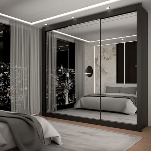 O(a) Guarda-Roupa Casal Del Plata 3 Portas 4 Gavetas Espelhado Preto - Loja é produzido em MDP na escala de brilho Brilhante e Fosco, e possui um grau de dificuldade de montagem: Médio.
