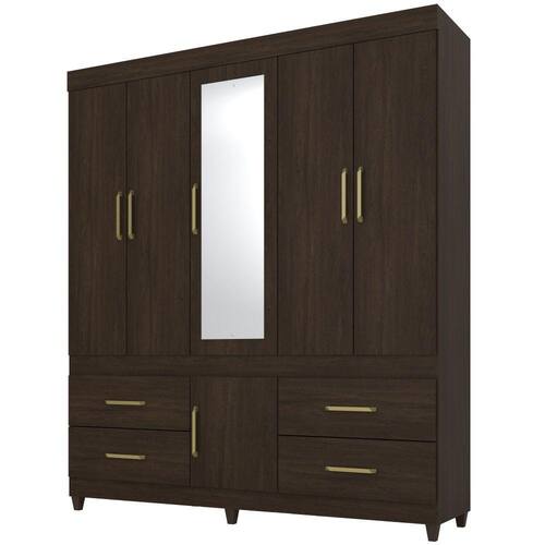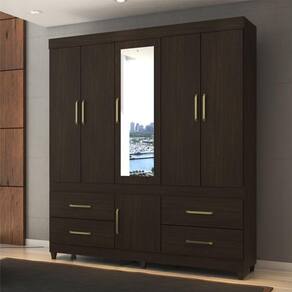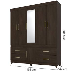 Estrutura: MDPAcabamento: Pintura U.V, de alto padrãoPorta: Sim, 06 portas de abrir, com dobradiças metálicasGaveta: Sim, 04 gavetas com corrediças metálicas e dimensões avantajadas que acomodam maior quantidades roupasPrateleiras: Sim, na divisão central e na parte inferiorCabideiro/Calceiro: Sim, em metalEspelho: Sim, na porta centralPés: Sim, em PVC maior durabilidadePuxadores: Sim, em PVC na coloração bronzeDiferencial: Este Guarda-Roupa se destaca pela sua configuração interna e externa, oferecendo prateleiras na divisão central e compartimento inferior exclusivo para sapatosDimensões do produto Montado