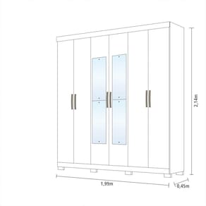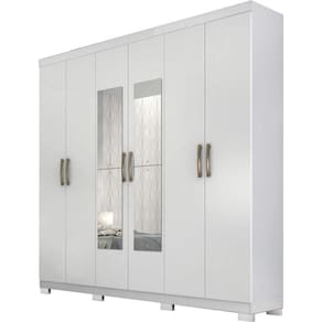 O Guarda Roupa Clara 100% MDF agrega elegância ao seu ambiente, com divisórias internas pensadas para uma perfeita organização e uso compartilhado. Portas com puxadores em ABS na cor bronze e kit com 4 espelhos. Contém 3 gavetas internas com corrediças telescópicas, os cabideiros são em alumínio com suportes metálicos. Este produto acompanha kit com 8 pés. Acabamento da Prateleira: Verniz Escala de Brilho da Prateleira: Brilhante Possui Cabideiros: 02 Acabamento da Gaveta: Verniz Escala de Brilho da Gaveta: Brilhante Material do Puxador da Gaveta: Possui Organizador de Gaveta: Não Acabamento da Porta: Verniz Escala de Brilho da Porta: Brilhante Material do Puxador da Porta: ABS Acabamento dos Pés: Pintura Acompanha Cama Auxiliar: Acompanha Colchão: Altura da Cama: Altura do Espelho: 65 Altura do Espelho 01: Altura do Espelho 02: Altura do Espelho 03: Altura do Espelho 04: Altura do Espelho 05: Altura do Espelho 06: Altura dos Pés: 5 Ambiente Principal: Quarto Cama Auxiliar Acompanha Colchão: Cama Auxiliar Suporta Até (kg): Cama Suporta Até (kg): Complexidade da Montagem: Alta: deve ser montado por um montador especializado Cor: Branco Cor do Produto: Branco Cor Flex: Cor Interna: Branco Escala de Brilho: Brilhante Espessura do Espelho: 3 Fita Integrada: Formato do Espelho: Retangular Gaveta com Chave: Não Guarda-Roupa Suporta Até (kg): 60 Informações Complementares: Itens Inclusos: 1 Guarda Roupa e Manual de Montagem. Largura da Cama: Largura do Espelho: 25 Largura do Espelho 01: Largura do Espelho 02: Largura do Espelho 03: Largura do Espelho 04: Largura do Espelho 05: Largura do Espelho 06: Linha ou Coleção: Clara Manual de Especificação Técnica: Manual de Montagem e Instalação: https://cdn2.madeiramadeira.com.br/atributo/panan-m-veis/875078-roupeiro-clara-6-portas-flex-telesc-pica.pdf Material da Gaveta: MDF Material da Porta: MDF Material da Prateleira: MDF Material dos Pés: ABS Material Principal: MDF Montagem Flex: Não Necessita Montagem: Sim Origem do Produto: Nacional Peso: 126,5 Peso Máximo por Gaveta: 5 Peso Máximo por Prateleira: 5 Possui Calceiros: Não Possui Espaço para Vestidos Longos: Possui Espelho: Sim Possui Espelho Interno: Possui Ganchos: Possui iluminação: Possui Painel de TV: Possui Pés: 08 Possui Portas: 06 Possui Prateleiras: 06 Possui Sapateira: Profundida de Cama: Quantidade de Espelho: 04 Espelhos com Tamanhos Iguais Recomendações de Uso, Manutenção e Limpeza: Limpeza com pano levemente umedecido em seguida flanela seca. Não aplicar qualquer produto de limpeza ou cera. Sapatas Niveladoras: Não Sistema de Montagem: Parafusos, cavilhas, miniflix, prego, pino doiratório, chave zeta Tamanho: Tamanho do Colchão Indicado (L x C): Tamanho do Colchão Indicado Cama Auxiliar: Tipo de Corrediça da Gaveta: Metálica Telescópica Tipo de Dobradiça/Corrediça da Porta: Alumínio Tipo de Estrado: Tipo de Fixação do Espelho: Parafusos Tipo de Gaveta: Interna Tipo de Guarda-Roupa: Casal Tipo de Madeira Maciça: Tipo de Madeira Maciça da Gaveta: Tipo de Madeira Maciça da Porta: Tipo de Madeira Maciça da Prateleira: Tipo de Madeira Maciça do Puxador da Gaveta: Tipo de Madeira Maciça do Puxador da Porta: Tipo de Madeira Maciça dos Pés: Tipo de Puxador da Gaveta: Não Possui Tipo de Puxador da Porta: Externo