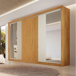 O Guarda Roupa Vitoria com espelho é a união de qualidade, tamanho e beleza. Este Roupeiro é perfeito para seu espaço. Possui excelente espaço interno com 06 gavetas com corrediças telescópicas que permite maior aproveitamento interno e duas gavetas que possuem chaves para armazenar com segurança seus pertences. Possui compartimento para malas e roupas de cama. Prateleiras fixas e prateleiras removíveis para poder acomodar roupas longas. Possui também compartimento para calçados. Para maior durabilidade possui costas grossas parafusadas. Os trilhos inferior e superior são em alumínio. A porta central tem o designer ripado . As portas laterais possuem dois espelhos, Com os puxadores em perfil de alumínio. Possui roldanas com molas, nesse sistema a porta não sai do trilho. Produto tendência ripado em MDF