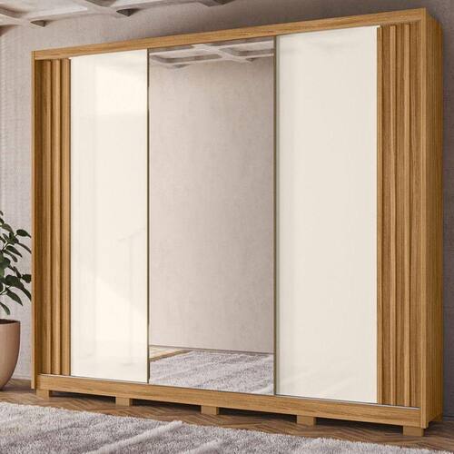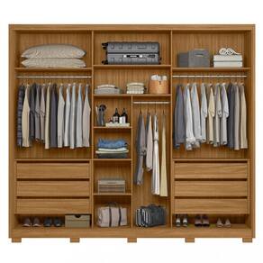 Características: Estrutura em MDP 3 Portas 6 Gavetas Corrediças telescópicas Cabideiros em alumínio Pés em PVC Porta central com espelho Prateleira suporta 6kg cada Gaveta suporta 8kg cada Detalhes ripados nas portas
