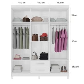 Materiais: Estrutura em MDP de 12mm (Portas e Frente de Gaveta em MDP de 15mm e fundo de 3mm), puxadores, dobradiças metálicas, cabideiro e corrediças.