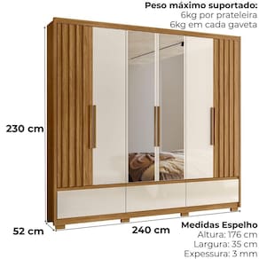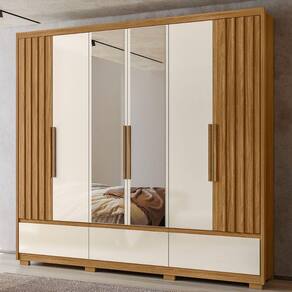 Desenvolvido para facilitar sua rotina, o Guarda-Roupa Casal Amazonas traz design funcional e amplo espaço interno. Estrutura em MDP (15/12 mm) e acabamento em pintura UV. Composto por portas com dobradiças metálicas e tripla opção de montagem (permitindo escolher a posição das portas com ripados em MDF e com espelho, seja na lateral ou ao centro), prateleiras internas, cabideiro interno em alumínio e gavetas com corrediças telescópicas. Produto com dupla opção de montagem: pés em PVC ou sapatas plásticas (2 mm) conforme preferência do cliente. Este produto será entregue em 05 volumes.