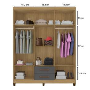 Materiais: Estrutura em MDP de 12mm (Portas e Frente de Gaveta em MDP de 15mm e fundo de 3mm), puxadores, dobradiças metálicas, cabideiro e corrediças.