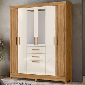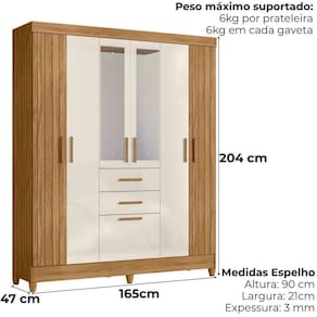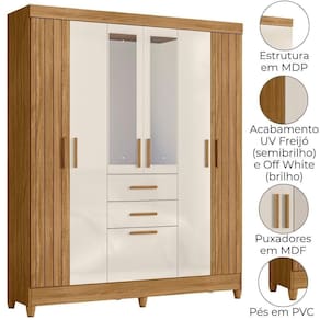 Desenvolvido para facilitar sua rotina, o Guarda-Roupa Casal Malta traz design funcional e amplo espaço interno. Estrutura em MDP (15/ 12 mm) e acabamento em pintura UV. Composto por portas com dobradiças metálicas (laterais em MDF com detalhes frisados e centrais com espelho), prateleiras internas, cabideiro interno (alumínio) e gavetas com corrediças metálicas. Produto com dupla opção de montagem: pés em PVC ou sapatas plásticas (2 mm) conforme preferência do cliente. Este produto será entregue em 04 volumes.