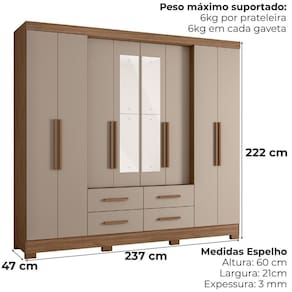 Projetado para atender às necessidades do dia a dia, o Guarda-Roupa Casal San Lorenzo oferece espaço e modernidade. Estrutura em MDP (15/12 mm) e acabamento em pintura UV. Composto por portas com dobradiças metálicas (centrais com espelho), prateleiras internas, cabideiro interno (alumínio) e gavetas com corrediças telescópicas. Produto com dupla opção de montagem: pés em PVC ou sapatas plásticas (2 mm) conforme a preferência do cliente. Este produto será entregue em 04 volumes.