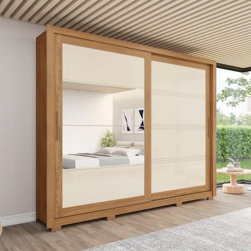 O Guarda Roupa Casal Espelhos 2 Portas de Correr 4 Gavetas Medelin Briz apresenta portas com um delicado desenho soft, oferecendo uma divisão interna excelente. Além disso, possui corrediças telescópicas que asseguram uma abertura suave e eficiente das gavetas, enquanto os cabideiros e calceiros, feitos em alumínio, garantem maior resistência. Os puxadores em alumínio com acabamento bronze e os pés em ABS complementam seu design elegante. Com amplos espaços e funcionalidade, este guarda-roupa proporciona praticidade para armazenar suas roupas e acessórios e transforme seu quarto em um ambiente mais bonito e organizado.