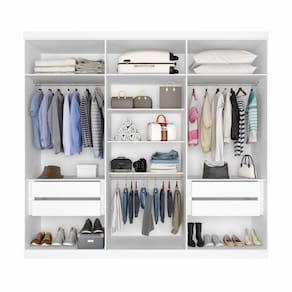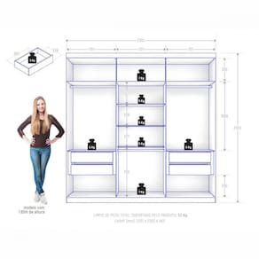 Características: - Estrutura em MDP de 12 e 15 mm - 4 gavetas com Corrediças Telescópicas - Cabideiro e Calceiro Metálicos - Dobradiça Metálica - Puxadores em MDF de 57 cm - Acabamento Semi fosco - Profundidade gaveta 0,35 - Suporte de peso das gavetas: 5 kg - Suporte de peso das prateleiras: 6 kg - Suporte de peso dos cabideiros: 3 kg - Garantia 03 meses
