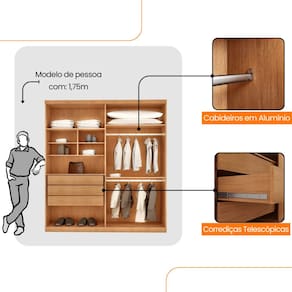 Características: Produto 100 MDF Calceiro e cabideiro em alumínio Corrediças telescópicas Estruturas em chapa de 15MM Puxadores em madeira Divisão em colmeia