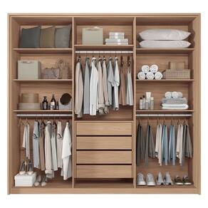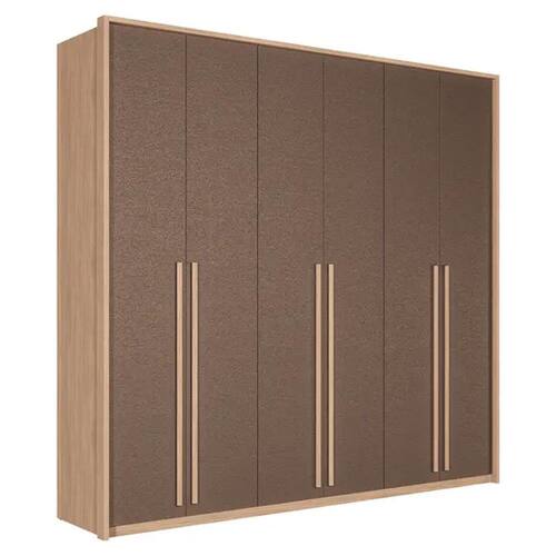 Qualidade e durabilidade! O roupeiro possui 6 portas de bater equipadas com dobradiças com amortecedores, que reduzem o barulho e prolongam a vida útil das portas. Além disso, suas 4 gavetas dispõem de corrediças telescópicas que proporcionam um deslize suave ao abrir e fechar. Os puxadores, fabricados em MDF, se destacam pelo acabamento texturizado que imita couro, e o móvel ainda conta com 3 cabideiros, ideais para quem prefere pendurar as roupas sem que elas se enverguem.