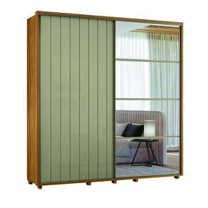 CARACTERÍSTICAS TÉCNICAS: - Produzido todo em MDF - Moldura em MDF de 25mm - Porta com ripado angular - Espelhos em 1 das portas - Acabamento em pintura UV fosco/brilho - 4 gavetas com corrediça telescópica - 2 portas de correr com sistema de amortecimento - 6 cabideiros em alumínio, sendo os 2 superiores extensíveis e 1 para roupas longas - Puxadores em Alumínio - 6 nichos